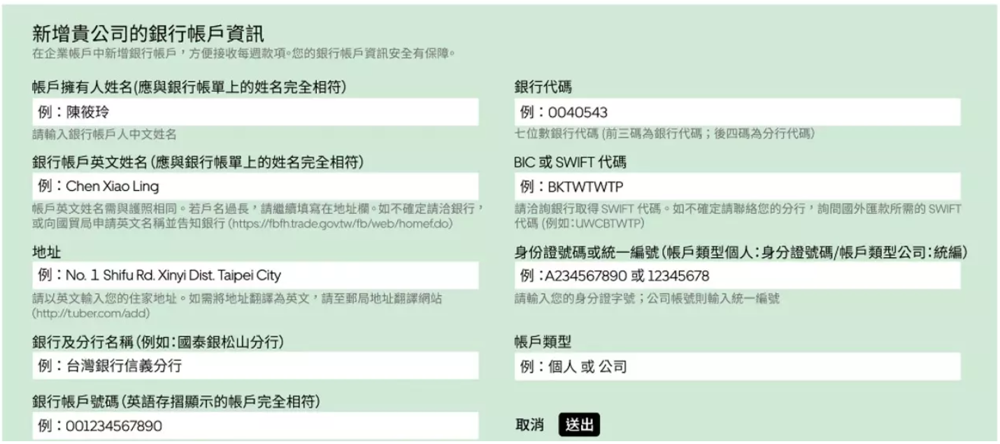 銀行帳戶建置是確保商家能準時收到款項的重要步驟,請依照範例說明正確填寫相關銀行資訊。填寫時,請務必確認所提供的帳戶資料完整且正確,以避免影響後續撥款作業。 另外,銀行帳戶資訊必須與合約中所登記的負責人資料一致,包含帳戶名稱及相關身分資訊,若資料不符,可能導致款項無法順利入帳。完成設定後,建議再次檢查所有填寫內容,確保資料正確無誤,以保障款項能依時撥付並順利完成金流流程。